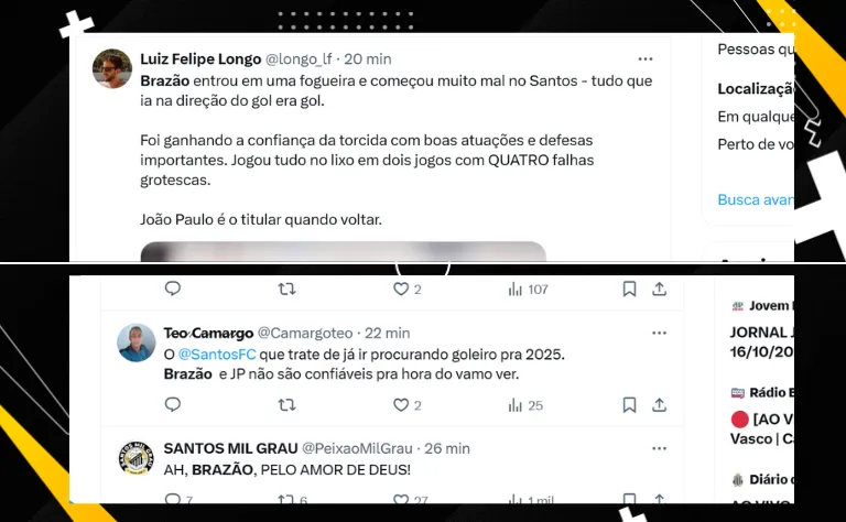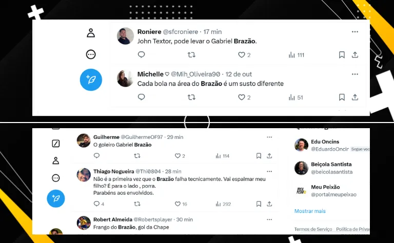 “Brazão foi ganhando a confiança da torcida com boas atuações e defesas importantes. jogou tudo no lixo em dois jogos com QUATRO falhas grotescas. João Paulo é o titular quando voltar”, completou mais um santista irritado após o jogo.