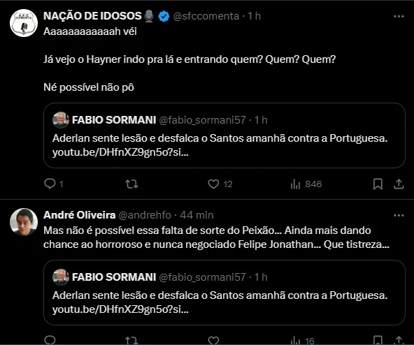 A notícia deste sábado é essa. Nada boa. A gente queria ver o Santos completinho, mas o Aderlan sentiu uma lesão muscular. Só um milagre coloca ele em campo contra a Portuguesa“, disse Sormani, em vídeo no seu canal no YouTube.
