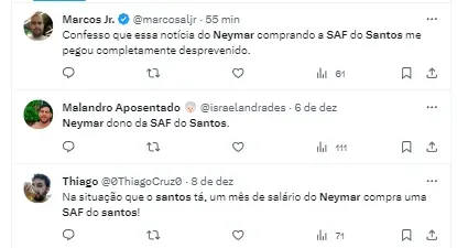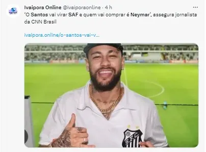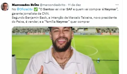 O jornalista Benjamin Back, da CNN, em vídeo publicado pelo canal do YouTube da emissora, afirmou que o Santos vai se tornar uma SAF. Ele foi além e disse que os donos do Peixe serão Neymar e seu Pai. Vale destacar que já houve uma aproximação da família com o novo presidente Marcelo Teixeira, que já se mostrou favorável a SAF no Clube.