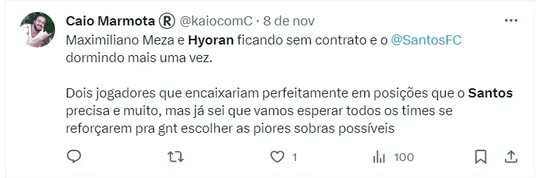 Apesar da decisão final ser do próximo mandatário, a gestão do Santos vê com bons olhos a contratação do reforço. Mas, analisa a situação com cautela para não deixar essa oportunidade acabar escapando. Já que pode ser a primeira contratação do Clube para a próxima temporada.