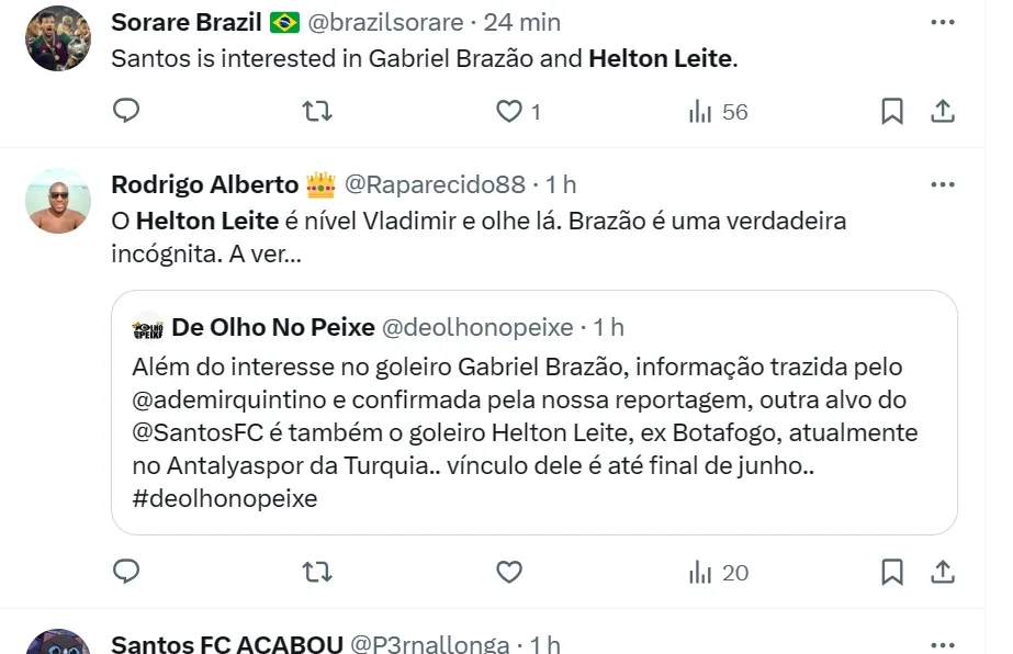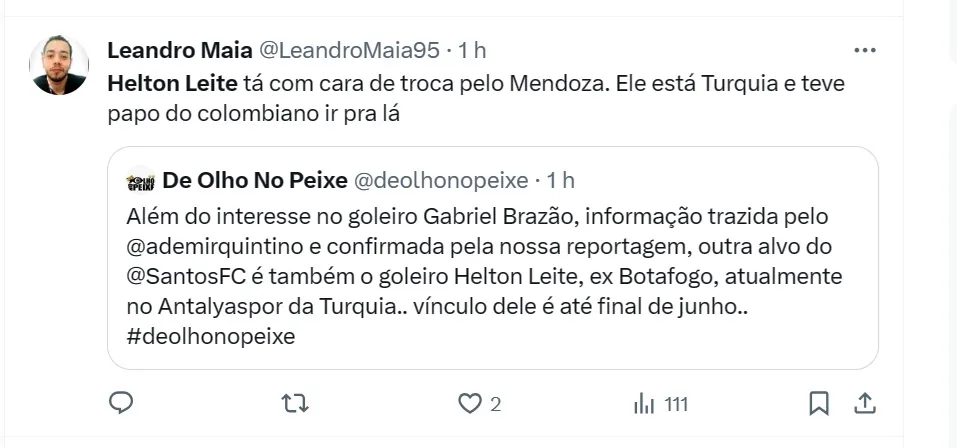 Com informações da equipe do portal ‘De Olho no Peixe’, o goleiro buscado pelo Alvinegro Praiano é Helton Leite, hoje em fim de contrato no Antalyaspor, da Turquia. Ele é revelado pelo Grêmio.