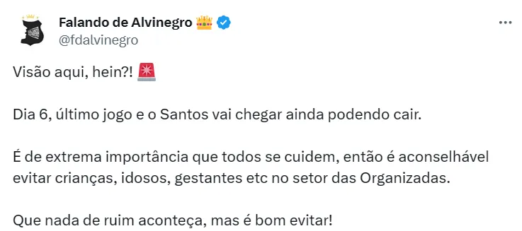 Sendo assim, nas redes sociais é comentado – e aconselhado – que não levem crianças, idosos e grávidas, afim de se evitar uma possível tragédia aos arredores do estádio ou nas arquibancadas do Urbano Caldeira.