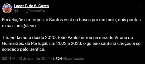 “Titular da meta desde 2020, João Paulo entrou na mira do Vitória de Guimarães, de Portugal. Em 2022 e 2023, o goleiro santista chegou a ser sondado pelo Benfica” , escreveu Lucas Costa.