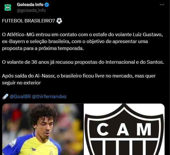 Apesar da boa fase, a diretoria do Santos segue de olho no mercado e um dos jogadores ventilados no Peixe foi o volante Luiz Gustavo, que está livre no mercado desde que deixou o Al-Nassr, da Arábia Saudita, no meio desta temporada. No entanto, o Alvinegro ganhou um concorrente na briga pelo jogador. Trata-se do Atlético-MG.