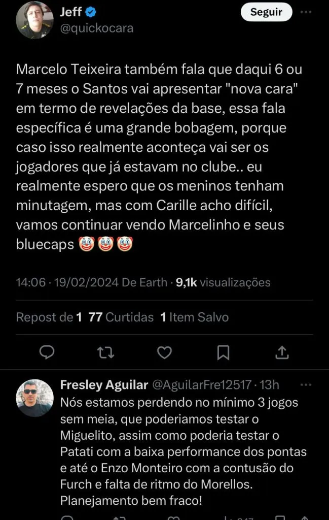 “Para todos, elenco e comissão técnica, temos duas fases nesses contratos profissionais. Há metas e objetivos para a temporada 2024 e temos as renovações automáticas exatamente quando alcançarmos os nossos objetivos. O Santos está em um momento onde não deve estar, disputando algo que não estamos acostumados”, continuou.