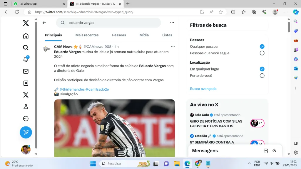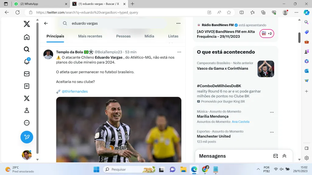 Alvo do Peixe em janeiro, o chileno Eduardo Vargas surgiu novamente na mesa alvinegra. O atacante de 34 anos não deve permanecer no Atlético-MG em 2024 e já vem buscando uma nova equipe.