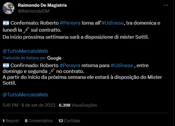 “Confirmado: Roberto Pereyra retorna para #dinese , entre domingo e segunda assinará o contrato. A partir do início da próxima semana ele estará à disposição do Mister Sottil”, escreveu o jornalista, cravando que Pereyra atuará na Udinese, atualmente a 17ª colocada do Italiano, com dois pontos em três partidas.