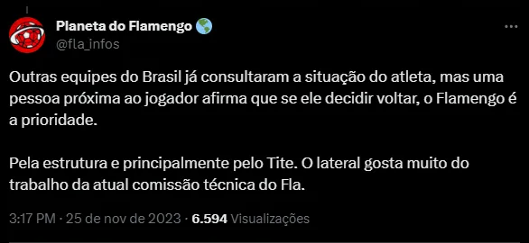 “Ele é o nome do Flamengo para a lateral, mas não será simples. Outras equipes já consultaram a sua situação, mas o que eu soube de uma pessoa próxima ao jogador é que se ele decidir voltar, o Flamengo é a prioridade“, disse Raisa.