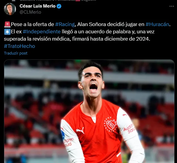 No entanto, Soñora não chegou a um acordo com o Peixe e, segundo o jornalista Cesar Luiz Merlo, o americano acertou com o Huracán, da Argentina. Falta somente os exames médicos para assinatura do contrato, que deve ser até o final de 2024.