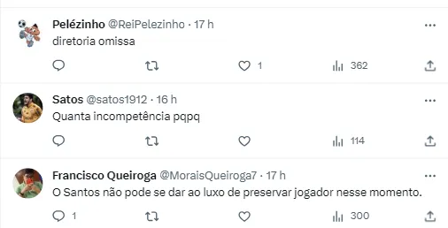 “Muita burrice deixar o sorteio de fora. Muita incompetência, desse jeito vai cair!” , “ Sem Jean Lucas, João Paulo e Soteldo. Como ficar confiante?” , “O Santos não pode se dar ao luxo de preservar jogador nesse momento” , “Quanta incompetência” , “É um jogo praticamente impossível mesmo, sem Jean Lucas e João Pedro seria burrice colocar Soteldo para o jogo. Decisão triste porém acertada”., publicaram.