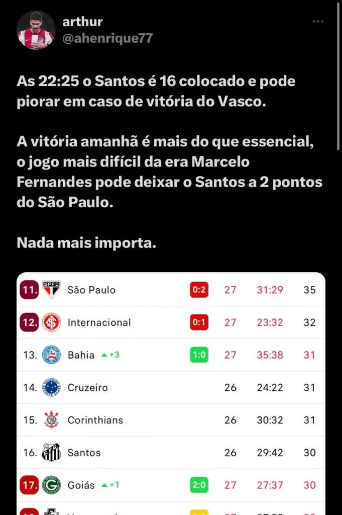 Com 30 pontos somados até aqui, o Santos dormiu na zona de rebaixamento após os resultados dos jogos desta quarta-feira (17). O time santista está remando contra a maré da Série B, vem de vitória importante em cima do Palmeiras por 2 a 1, na última rodada, agora, ele se prepara para encarar o vice-líder do Brasileirão, o RB Bragantino, nesta quinta-feira (19), às 20h, na Vila Belmiro.
