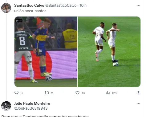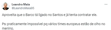 Um outro torcedor do Peixe foi mais lúcido e deixou claro que apesar de também querer Barco na equipe, ele sabe da dificuldade devido a concorrência com o futebol europeu. “Aproveita que o Barco tá ligado no Santos e já tenta contratar ele. Ps: praticamente impossível porque vários times europeus estão de olho no menino”.