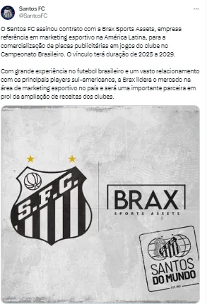“O Santos Futebol Clube firmou contrato com a Brax Sports Assets, empresa referência em marketing esportivo na América Latina, para a comercialização de placas publicitárias em jogos do Clube no Campeonato Brasileiro a partir de 2025. O vínculo terá duração de 2025 a 2029. Com grande experiência no futebol brasileiro e um vasto relacionamento com os principais players sul-americanos, a Brax lidera o mercado na área de marketing esportivo no país e será uma importante parceira em prol da ampliação de receitas dos clubes”, informou o Clube em nota.