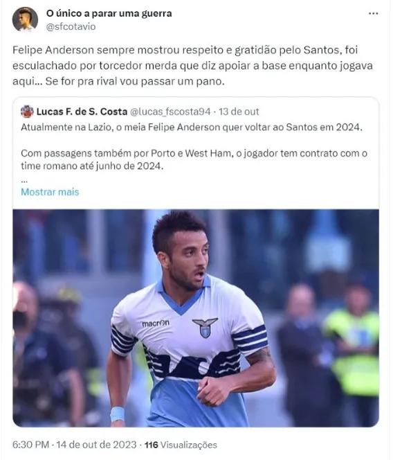 Um dos nomes que mais vinha sendo pedido pelos torcedores e especulado pelos dirigentes santistas, no entanto, pode acabar tomando outro rumo, jogando em um rival: A reportagem do Bolavip Brasil apurou que Felipe Anderson, atualmente na Lazio, com contrato até 2024, está sendo monitorado pelo Palmeiras.