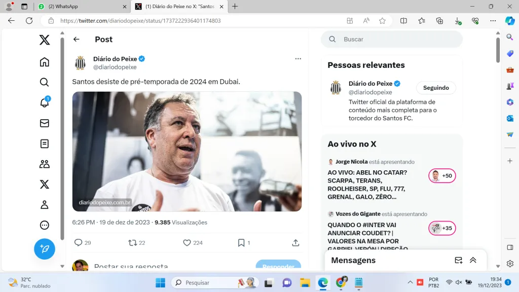 Só que há negócios nos bastidores que não deram certo. O setorista Lucas Barros, do portal Diário do Peixe, informou que o Santos não vai mais fazer a pré-temporada em Dubai, como era de interesse público. Teixeira confirmou a informação à reportagem.