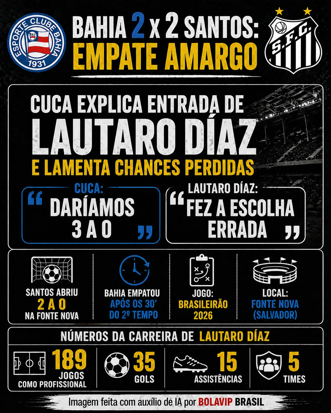 Mesmo sem poder contar com jogadores importantes diante do Bahia, como Neymar e Gabriel Brazão, o Santos chegou a abrir 2 a 0 em plena Fonte Nova. Todavia, sofreu dois gols após os 30 minutos do segundo tempo e cedeu o empate.