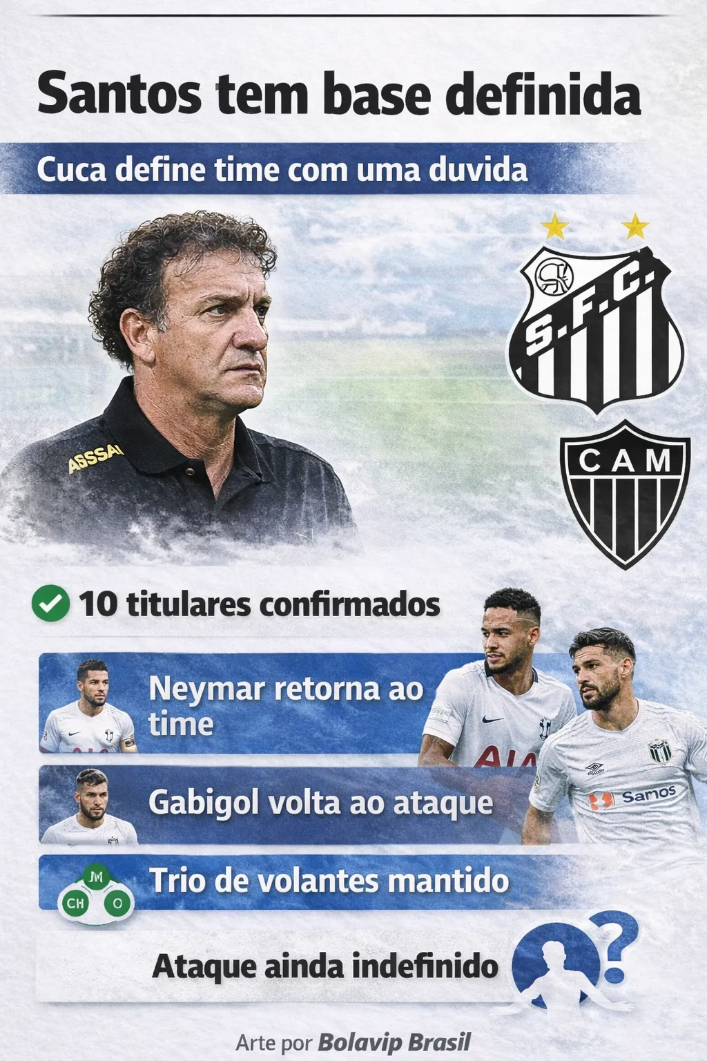 “Na perspectiva de Cuca, só vai ter uma dúvida na escalação se todos estiver bem fisicamente. Santos vai ter Gabriel Brazão, Igor Vinícius, Lucas Veríssimo, Luan Peres e Escobar; Gustavo Henrique, Christian Oliva, Gabriel Bontempo, Gabigol e Neymar”, explicou Musetti.