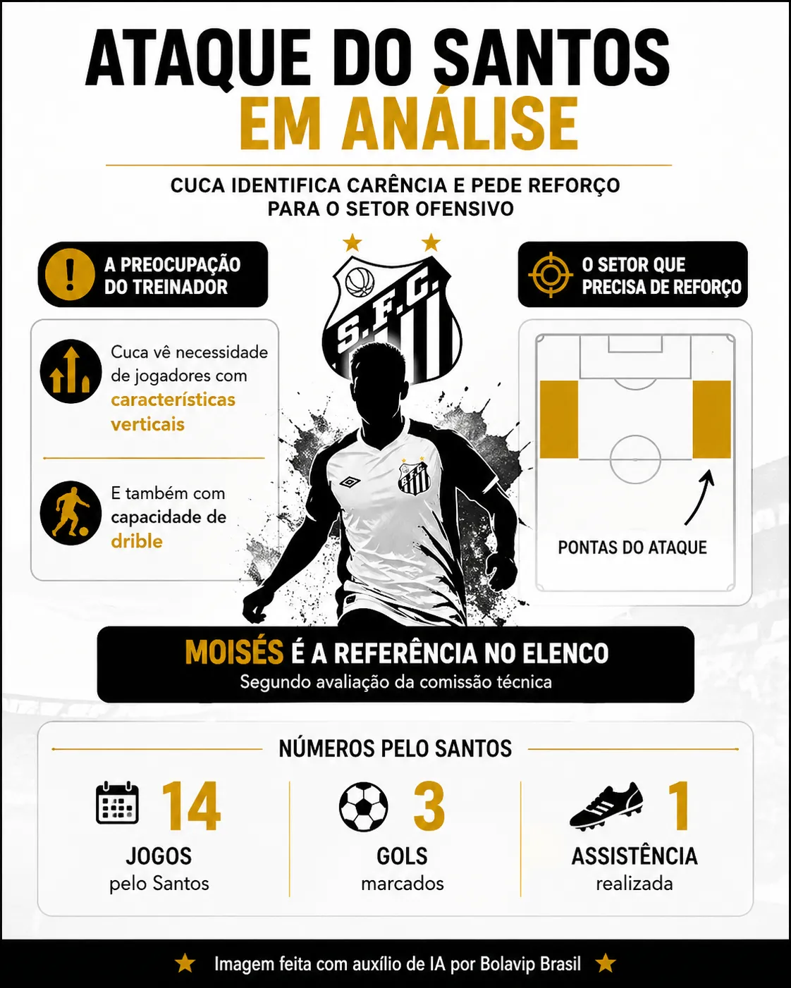 O trabalho de Cuca segue pressionado no Santos. A situação ficou mais crítica após o empate com o Bahia. De olho no elenco, o treinador olha com atenção para o ataque e avalia a ausência de uma característica no Peixe.