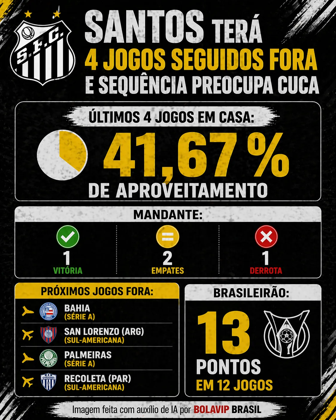 Só a título de exemplo, incluindo os jogos da Sul-Americana, do Brasileirão e da Copa do Brasil, foram quatro partidas seguidas como mandante. Ao todo, o Peixe somou dois empates, uma derrota e uma vitória, totalizando um aproveitamento de 41,67%.