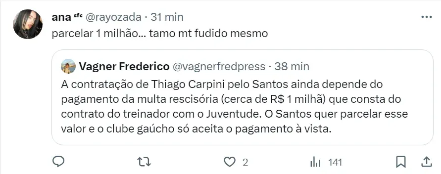 Thiago Carpini tem contrato com o Juventude até o fim do ano que vem e multa rescisória em cerca de R$ 1 milhão. O jornalista Vagner Frederico informou que o Clube de Caxias do Sul não aceita negociar.