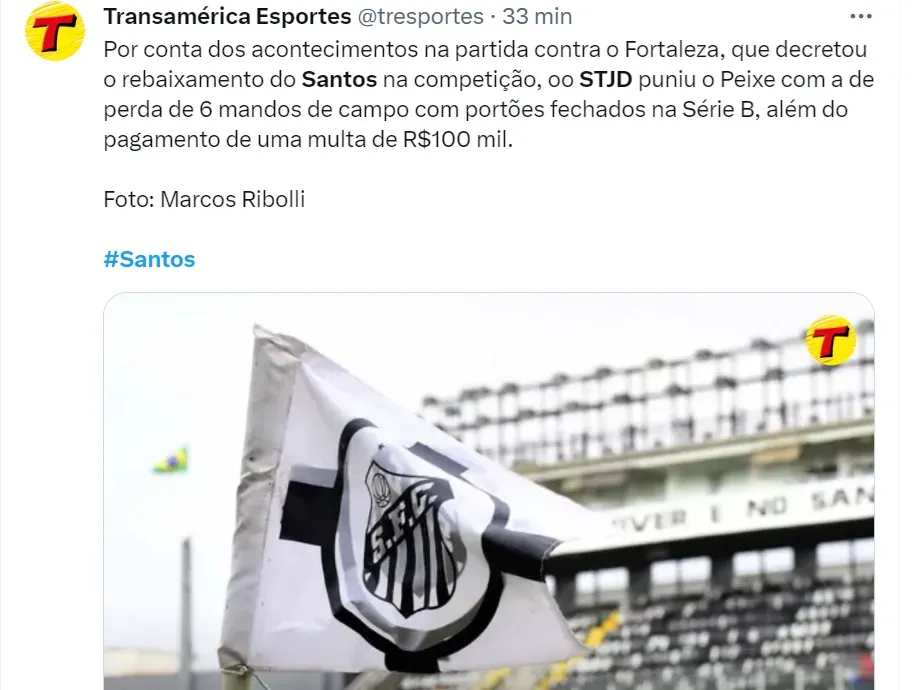 Por isso, o Alvinegro Praiano foi condenado a disputar seis partidas – 18 pontos em jogo – com portões fechados na Série B. Além disso, foi aplicada uma multa de R$ 100 mil. Cabe ao Peixe apresentar um recurso para tentar diminuir a pena.