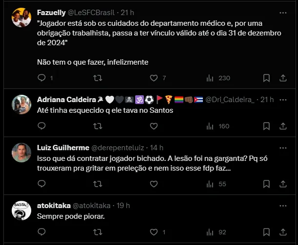 Os planos do Santos serão estabelecidos após o fim do Campeonato Brasileiro, tudo depende da permanência ou não na 1ª divisão. Atualmente, o Santos conta seis atletas com contrato até o fim de 2023.