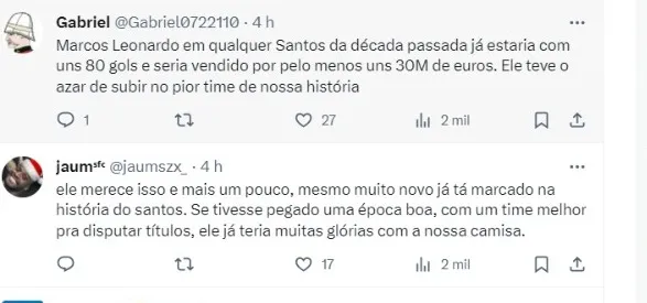 “O Santos tem a obrigação de fazer uma homenagem foda pro Marcos Leonardo contra o Fortaleza último jogo do garoto que se não fosse ele, o Santos seria o lanterna disparado. Uns dos maiores talentos que passou pós Neymar, o Marcos Leonardo merece DEMAIS”, escreveu um torcedor no X, antigo Twitter.