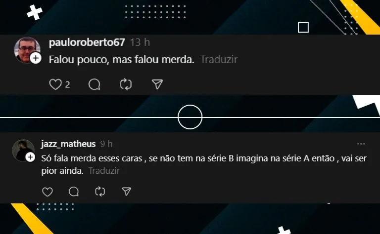 Na mesma plataforma, outro torcedor publicou: Não tem que ser um futebol vistoso, mas também não tem que fazer doer os olhos. O time é tenebroso”. “Os caras não conhecem/respeitam o time em que trabalham, da pena do Santos”, postou mais um.