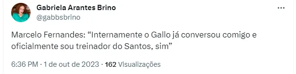 O próprio Marcelo Fernandes revelou na entrevista coletiva, após a goleada sobre o Vasco, que já foi avisado pela direção e que agora é oficialmente o técnico do Leão do Mar no restante do ano, na briga para evitar que a equipe seja rebaixada pela primeira vez em toda a sua história: “Internamente, o Gallo conversou comigo e ele confirmou, sim. Sou o treinador do Santos hoje”, revelou o agora comandante oficial do Peixe.