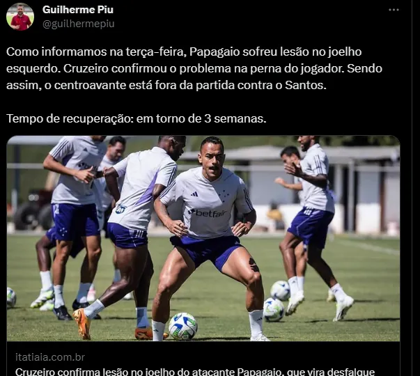Esse tento foi justamente contra o Corinthians, maior rival do Santos, no empate por 1 a 1, em duelo disputado no Mineirão. Papagaio recebeu bola na área e bateu de primeira no ângulo de Cássio para abrir o marcador. O rival empatou nos acréscimos. Portanto, será um desfalque duro para o Cruzeiro nesta partida diante do Santos.