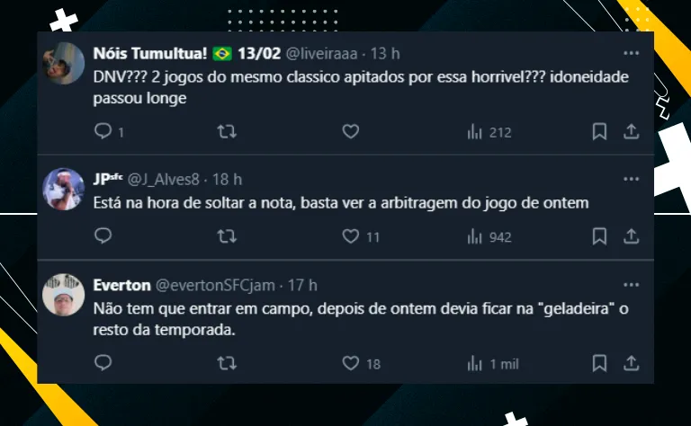 Vale mencionar que, além da postura no último clássico entre Coringão x Peixe não ter agradado, a arbitragem de Edina Alves em São Paulo x Novorizontino gerou grande repercussão e descontentamento.