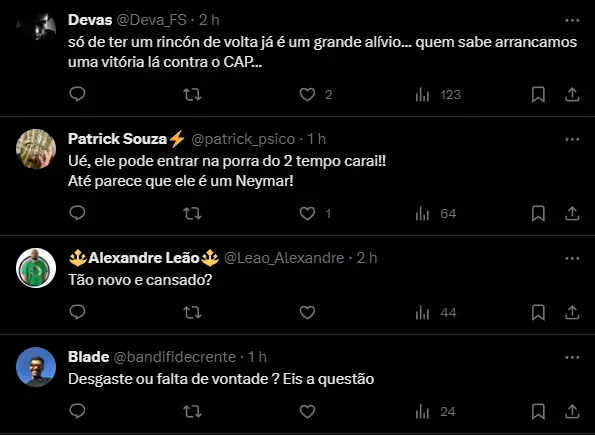 “Tão novo e cansado“, disse um torcedor nas redes sociais. Outros não aprovaram a decisão do treinador, preferem ver Marcos Leonardo entre os titulares. Até mesmo um pedido para ambos começarem na equipe titular.