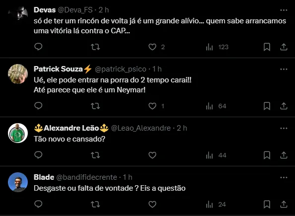 Tão novo e cansado“, disse um torcedor nas redes sociais. Outros não aprovaram a decisão do treinador, preferem ver Marcos Leonardo entre os titulares. Até mesmo um pedido para ambos começarem na equipe titular.