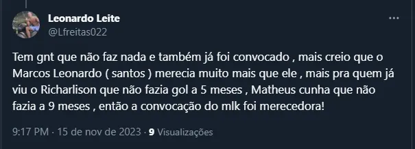 Eu acho (que Marcos Leonardo deveria ter sido convocado), porque já está insistindo muito com muita gente que já teve oportunidade. Eu acho que a grande diferença hoje é colocar esses jovens para ganhar cancha de Seleção Brasileira e terem a oportunidade”, iniciou.