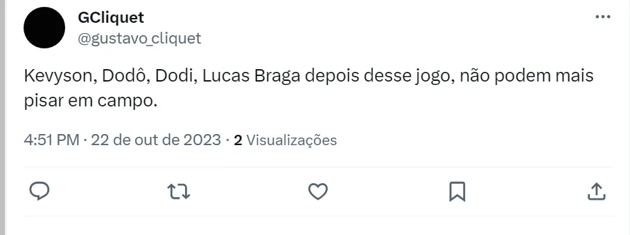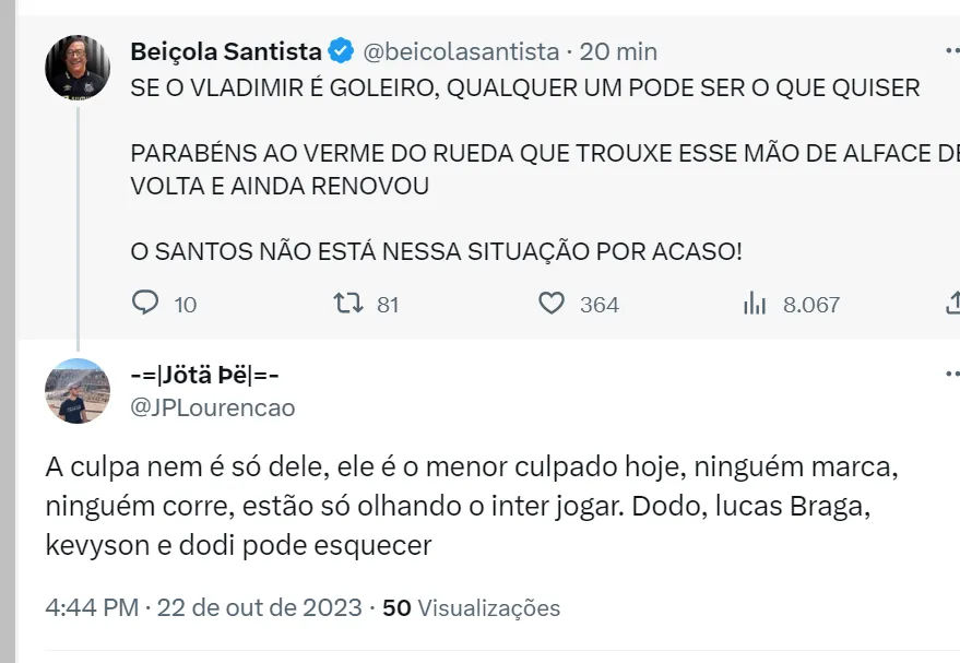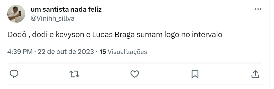 Nas redes sociais, os torcedores do Santos detonaram a dupla Kevyson e Dodô pelos erros cometidos no primeiro tempo em Porto Alegre. Mas eles não foram os únicos criticados. Pelo Twitter, os santistas estão na bronca com o atacante Lucas Braga, que joga improvisado de ala e o volante Dodi. Os dois jogadores cometeram vários erros contra o Colorado e também são alvos da torcida.