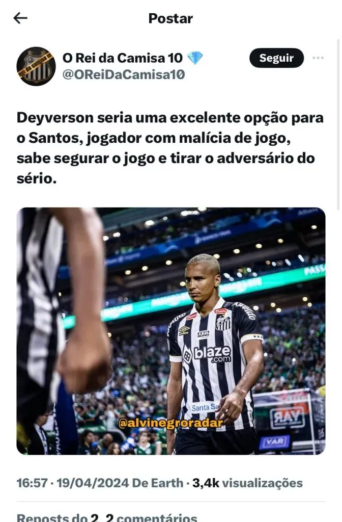 “O Deyverson não quis ir para o Santos, e o motivo de ele não querer ir, o próprio agente me disse, é que ele tem já um acordo verbal com um clube, e ele vai assinar um pré-contrato a partir do mês julho”, finalizou.