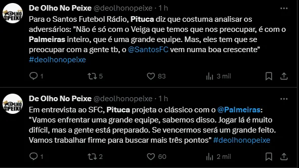 “Não é só com o Veiga que temos que nos preocupar, é com o Palmeiras inteiro, que é uma grande equipe. Mas, eles tem que se preocupar com a gente também, o Santos vem numa boa crescente“, disse Pituca, em entrevista ao Santos Futebol Rádio (SFR), da IS FM. O jogador continuou.