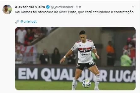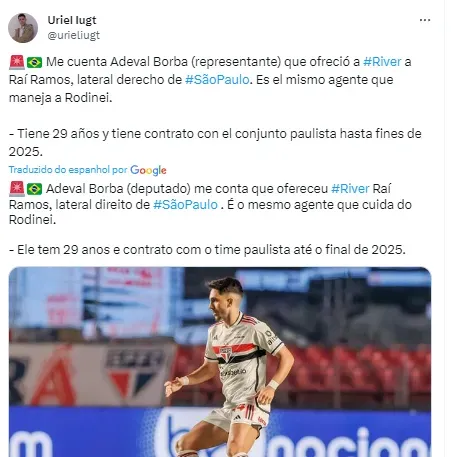 “Adeval Borba me conta que ofereceu ao River Raí Ramos, lateral-direito do São Paulo. É o mesmo agente que cuida do Rodinei. Ele tem 29 anos e contrato com o time paulista até o final de 2025”, publicou o jornalista.