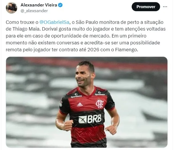 Como trouxe o jornalista Gabriel Sá, confirmada pela reportagem do Bolavip Brasil, o São Paulo monitora de perto a situação de Thiago Maia. Dorival gosta muito do jogador e tem atenções voltadas para ele em caso de oportunidade de mercado. Em um primeiro momento não existem conversas e acredita-se ser uma possibilidade remota pelo jogador ter contrato até 2026 com o Flamengo.