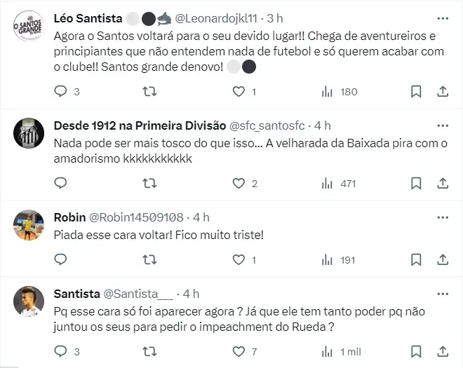 “Este é o primeiro passo para devolver o Santos ao patamar que jamais deveria ter saído. […] Os torcedores do Santos querem um clube moderno, que acompanhe as demandas do futebol atual”.