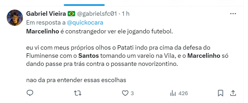 Foram cinco jogos em que Carille acionou o camisa 19 no Campeonato Paulista. Entretanto, Marcelinho ainda não soma gols e assistências. Contra o Novorizontino, foi um dos mais criticados pela torcida alvinegra na Vila.
