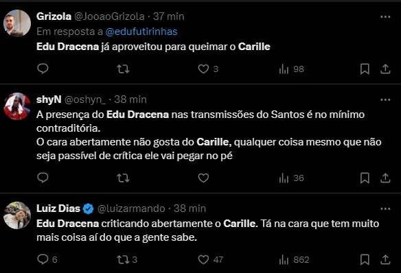“Edu Dracena já aproveitou para queimar o Carille”, “O cara abertamente não gosta do Carille, qualquer coisa mesmo que não seja passível de crítica ele vai pegar no pé” e “Edu Dracena criticando abertamente o Carille. Tá na cara que tem muito mais coisa aí do que a gente sabe”, foram algumas opiniões.