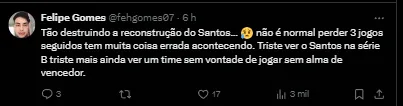 O comandante do Novorizontino ainda disse que sua equipe chegou a dar espaço para que o Peixe pudesse jogar e isso foi um erro. Segundo ele, com um elenco qualificado e o bom time que a equipe santista tem, as chances começaram a aparecer.