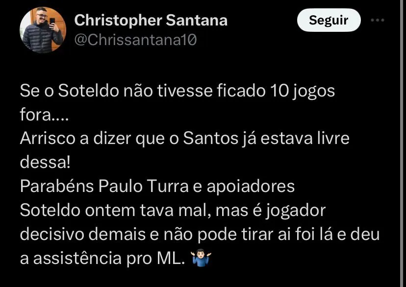 “O Soteldo está trabalhando demais. Está indo para a academia, voltando para treinar. Está feliz, com a filhinha nova aí. É um cara que está se dedicando muito ao clube, por tudo o que passou ainda. Foi muito fiel”, valorizou o treinador.