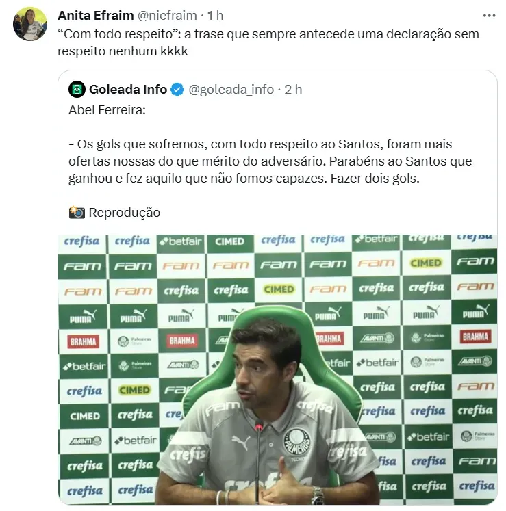 Após a partida, Abel Ferreira analisou a derrota do seu time e, em sua visão, os gols marcados pelo Santos foram mais por falhas do sistema defensivo palmeirense do que por méritos do adversário. A declaração não pegou bem entre os santistas nas redes sociais, principalmente pelo fato de que o primeiro gol, por exemplo, surgiu de uma jogada ensaiada.