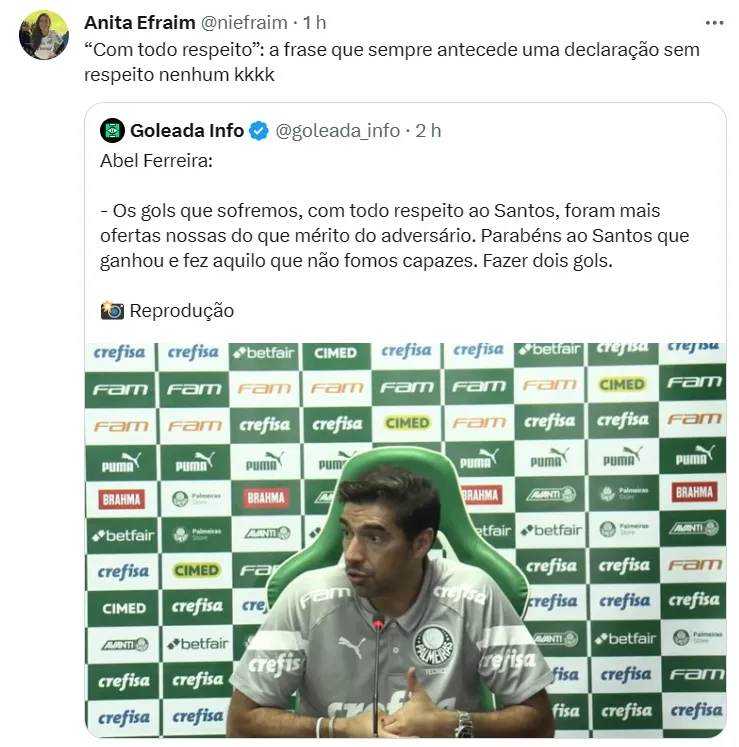 “Os gols que sofremos, com todo respeito ao Santos, foram mais ofertas nossas do que mérito do adversário. Parabéns ao Santos que ganhou e fez aquilo que não fomos capazes: fazer dois gols“, opinou. Em contrapartida, Marcelo Fernandes explicou como pensou o jogo para vencer o Palmeiras. “O que falei para eles é que: jogar um clássico contra eles é difícil? É. Mas a gente estava vendo que tinha condições de chegar. A gente não estava encurtando quando tinha de chegar. Aí falei: vamos ganhar o jogo”, disse.