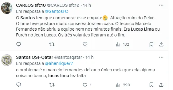 “Time com uma cratera no meio de campo e esse covarde não aciona o Lucas Lima”. “Nonato não tinha que sair… qual a dificuldade de montar uma linha de maio campo ofensivo com Nonato, Soteldo e Lucas Lima, Marcelo?”. “O problema é o Marcelo Fernandes deixar o único meia que cria alguma coisa no banco, Lucas Lima fez falta”, criticaram mais santistas sobre a decisão.