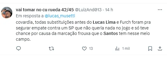Outro torcedor cobrou a atitude de focar na defesa da equipe em vez do ataque. “Covardia, todas substituições antes do Lucas Lima e Furch foram pra segurar empate contra um SP que não queria nada no jogo e só teve chance por causa da marcação frouxa que o Santos tem nesse meio-campo”.