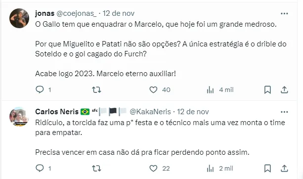 “A gente analisa muito a tabela, gosto de analisar. Era Cruzeiro X Vasco no meio da semana, mas o América não tinha campo e foi jogar em Uberlândia. Não entendi isso. Não sou a pessoa indicada para falar de calendário”, iniciou Marcelo.