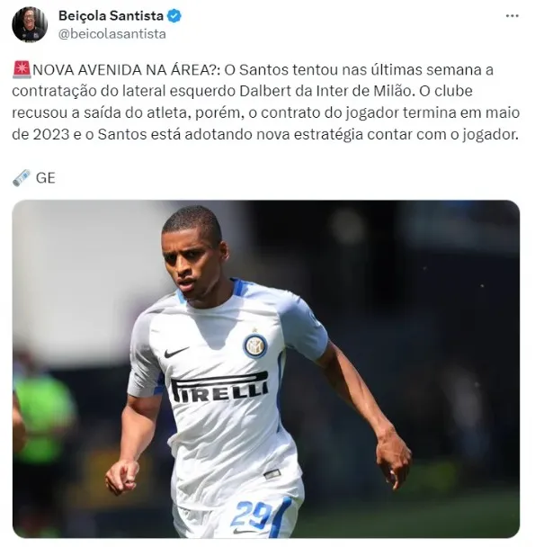 O Santos tentou a contratação do lateral esquerdo Dalbert, de 29 anos, que pertencia a Inter de Milão, em fevereiro deste ano. Na ocasião, o jogador também foi muito ligado a uma possível transferência ao rival São Paulo, o que não se concretizou.